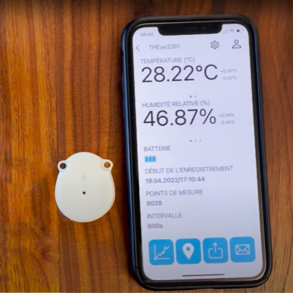 Le capteur interne haute précision enregistre automatiquement les données et les conserve dans la mémoire intégrée, qui peut contenir plus de cent soixante-dix mille mesures. La lecture des valeurs est simple et immédiate, il suffit d'approcher un smartphone et d'utiliser l'application THEye Controller pour visualiser l'historique, contrôler les valeurs en temps réel, exporter les données ou configurer des seuils d'alarme pour la température et l'humidité. En cas de dépassement des limites définies, l'appareil signale l'anomalie avec des indicateurs visuels et via l'application elle-même.